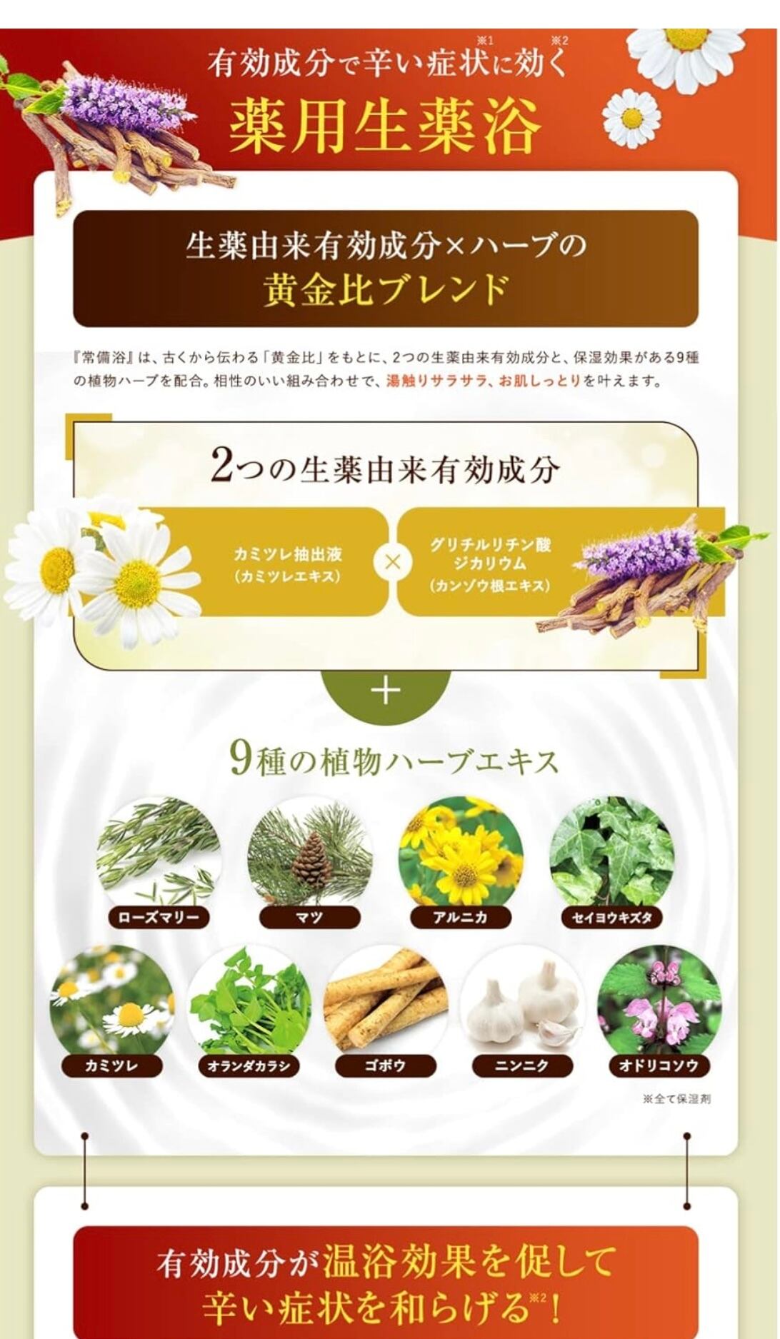 【効能・効果】あせも、荒れ性、うちみ、くじき、肩のこり、神経痛、しっしん、しもやけ、痔、冷え症、腰痛、リウマチ、疲労回復、ひび、あかぎれ、産前産後の冷え症、にきび